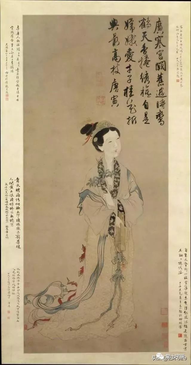 作者在人物创作的审美取向上以明代唐寅、仇英笔下的仕女画为审美标准,追求秀润飘逸的情致。她们三五成群地行进在以界画表现的亭台楼阁内或是细笔勾染皴点的花石下。富贵闲逸的宫苑生活令她们的物质生活十分充足,也使她们的精神世界极度贫乏。