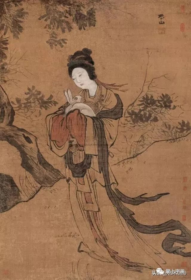 唐寅(伯虎),应该是大家最熟悉的一位明朝才子。这幅画中的嫦娥,裙带飘零,神形和顺,纤纤玉手中拿着一枝木樨,彷佛在等着什么人的到来。嫦娥的面部设色敷白色晕染,如月色清凝,皎洁典雅。数百年过去,虽然画面由于年月长远有些褪色,但更增加了一种古色古香和清爽高雅的感受。